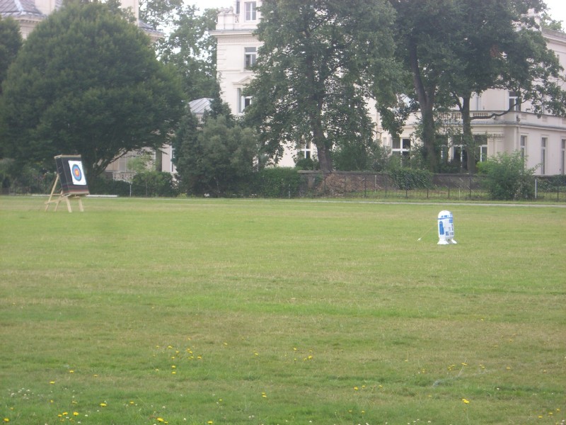 14:58:48 Now you may not be able to appreciate this unless you look at the full size picture. On the way into Kensington Palace Gardens we saw some people practising archery on one of the lawns. Fair enough. What I didn't really expect to see though was R2D2 in that archery field. That was a bit odd. | 15:39:58 A close up on my stand - scones with two types of jam (one might have been fig, the other perhaps apricot?) and clotted cream. On the top a selection of little cakes - two delicate little sponge cakes, a chocolate meringue and just obscured from view a custard tart (which I successfully traded for a piece of lemon sponge cake). | 15:42:08 Me and Andy with a flute of champers each. In this picture he's the straight man, and I'm the funny man. | 15:42:15 Chie wanted to get in the statue in the middle of the room. |
