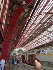 11:39:53 Ghent station. | 12:55:05 ...and now Antwerp station. | 12:57:23 Chie and her Mum at Antwerp station. | 13:32:27 There were a few fairground rides outside Antwerp station. I thought Erika looked rather suave in this classic car (unfortunately I couldn't manage to get a photo of her facing me!). |