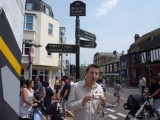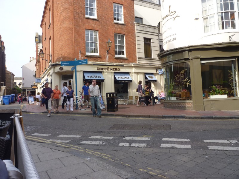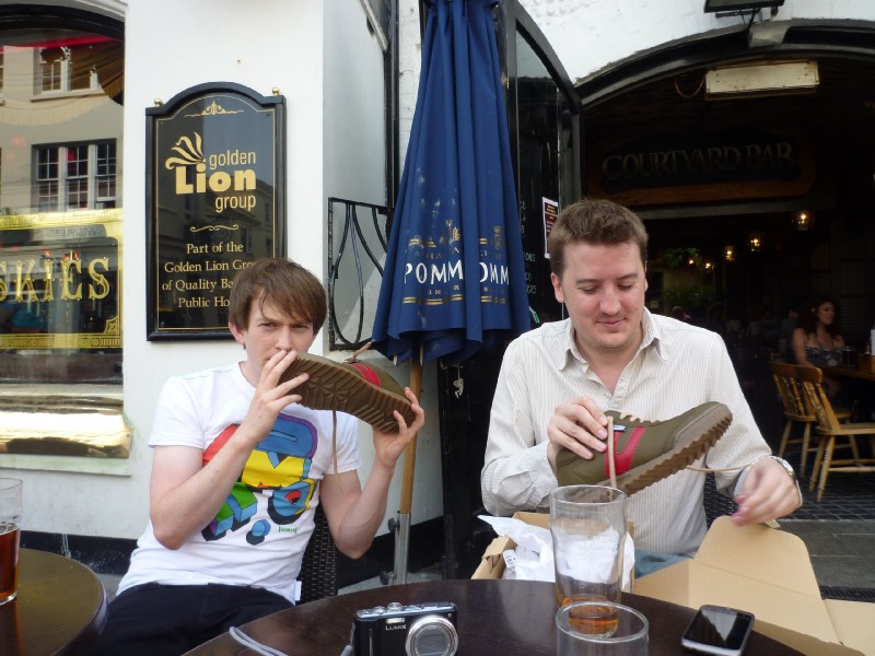 | 16:37:22 A view along the beach at Brighton. | 16:59:55 The Cricketers, quite possibly the oldest pub in Brighton. | 17:18:02 Me and Gav inspecting one of my new pairs of shoes. |