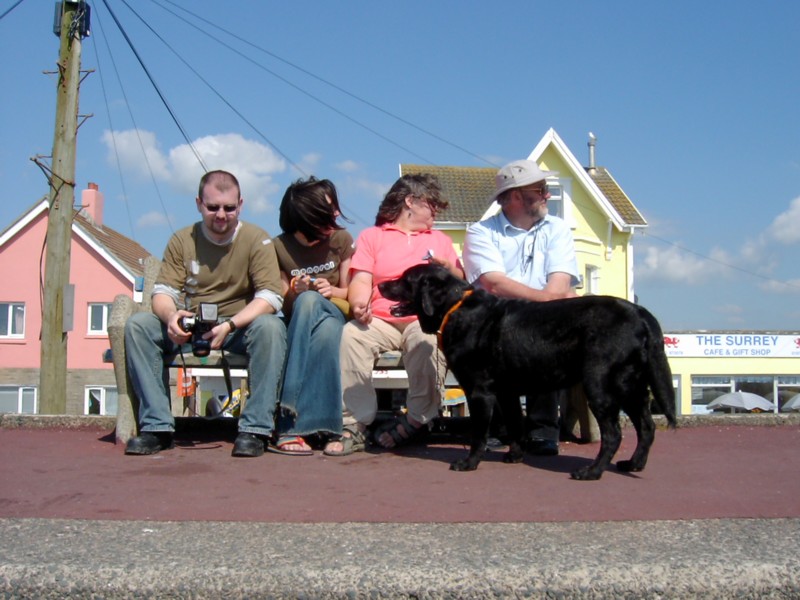 Martin, Lucy, Janie and Dad, sitting on a bench, having an ice cream. How British!