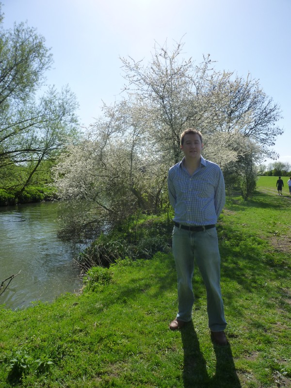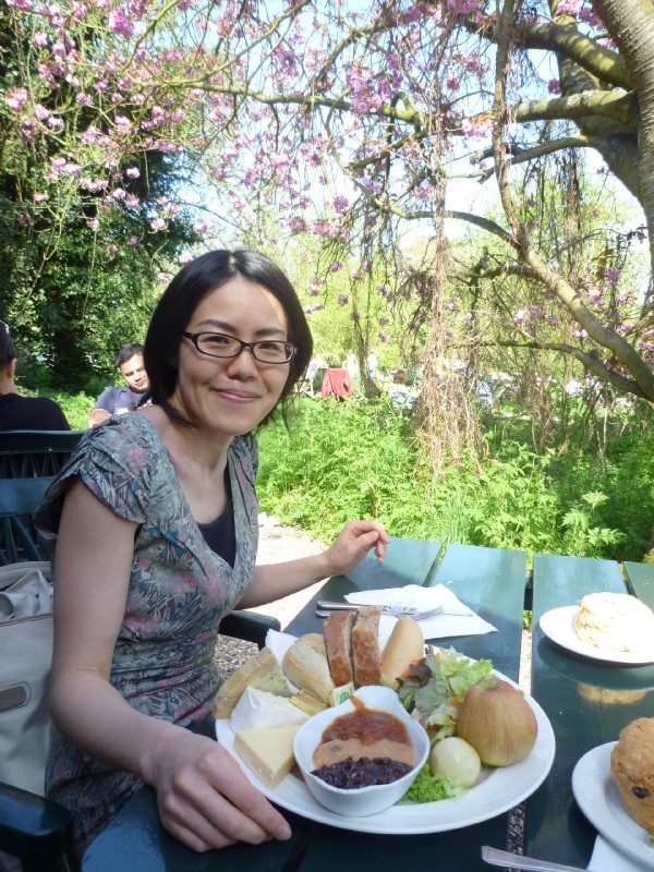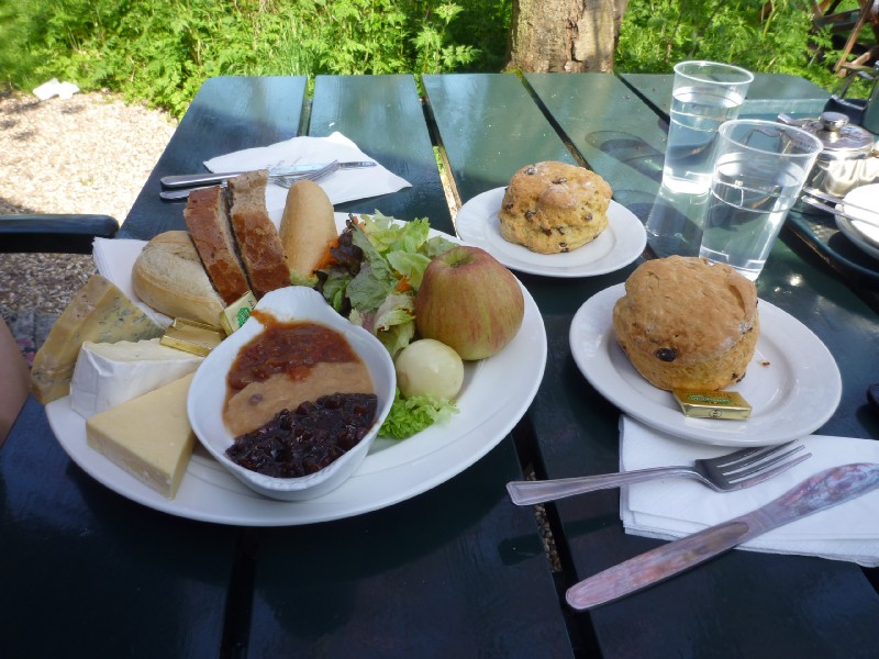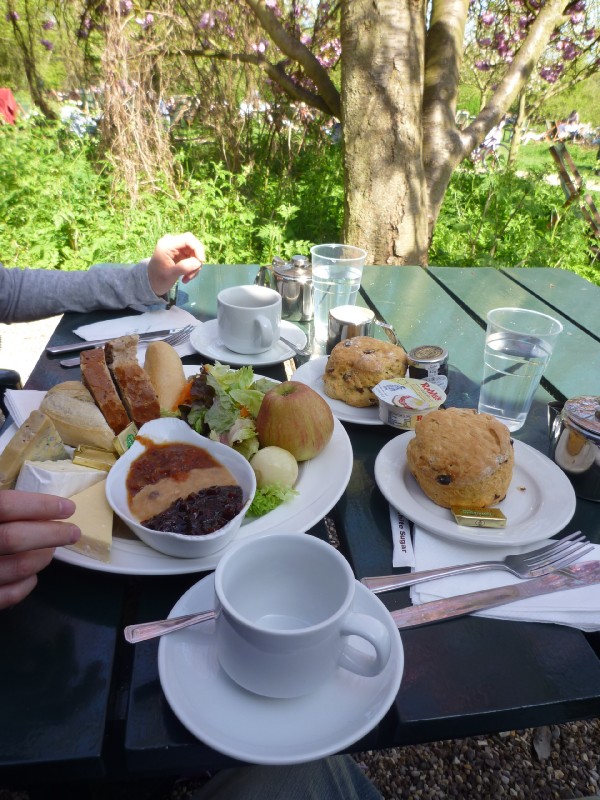 13:58:10 There's the river Cam. | 13:58:22 Me and the river Cam and a blossoming tree. | 14:32:19 At the Orchard Tea Rooms now, of Rupert Brooke fame. Here's the ploughman's lunch we ordered. | 14:32:26 ....and of course a couple of scones. |