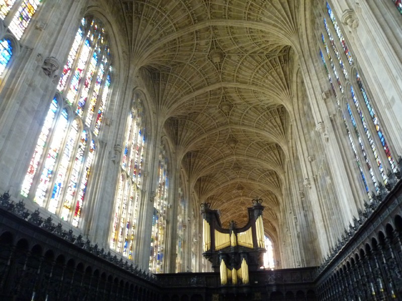 16:06:57 Approaching the outskirts of Cambridge. Unfortunately my camera seems to have developed a strange artefact, which cleaning the lens did not resolve. It only really seems to show up in blue sky so maybe it has been there for months! | 16:23:32 Inside King's College Chapel. | 16:23:38 A fine example perpendicular style of Gothic - the windows all have these tall parallel panels, without much tracery. | 16:25:33 |