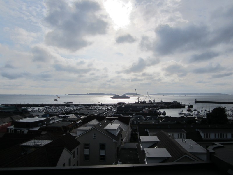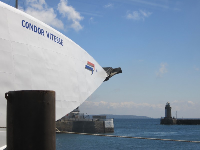 11:25:36 St. Peter Port seen from the harbour. | 12:28:01 Thre's the first glimpse of our boat, which was quite delayed. | 12:34:46 Coming into port now. | 12:39:28 The Condor Vitesse. |