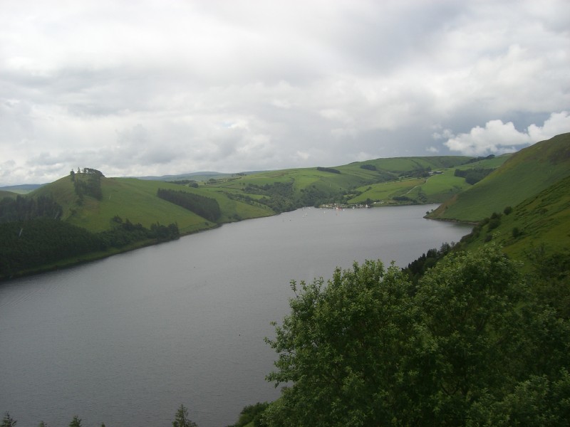 | 12:43:57 Chie standing in front of the big lake / reservoir just after Llanidloes (I think it is called Llyn Clywedog?). | 12:44:45 The whole family with that fabulous view behind them. | 12:45:12 ...more pictures of the lake... |