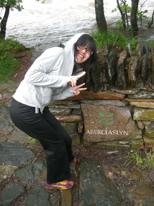 | 15:52:18 Chie in front of an Aberglaslyn sign - this is the name of a sort of outward bound school trip centre I stayed at near here when I was a kid. | 15:52:50 After a brief spell outside, everybody wisely returns to the car! | 16:09:03 The waterfalls coming down the sides of the mountains were rather dramatic. |