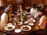 | 20:13:08 Our table, all looking quite jolly! | 20:37:28 My main course - a very interesting spring roll with blue cheese and vegetables. This was also very good, but my recent stomach problem was starting to catch up with me by this point, and I couldn't manage much of it. | 20:37:41 ...the whole table with their main courses. |