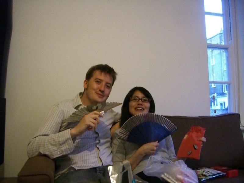 | 20:16:09 Back in London now - having Japanese food in mine and Chie's flat. | 21:03:40 Me and Chie with the fans that Mikiko-san had brought for us from Japan. |