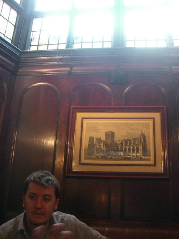 | 19:55:38 Another nice picture of Chie and her Dad with beer! | 20:03:40 Me and a picture of what I believe to be York Minister. | 20:03:45 The tall windows in the back bar of The Cittie. |