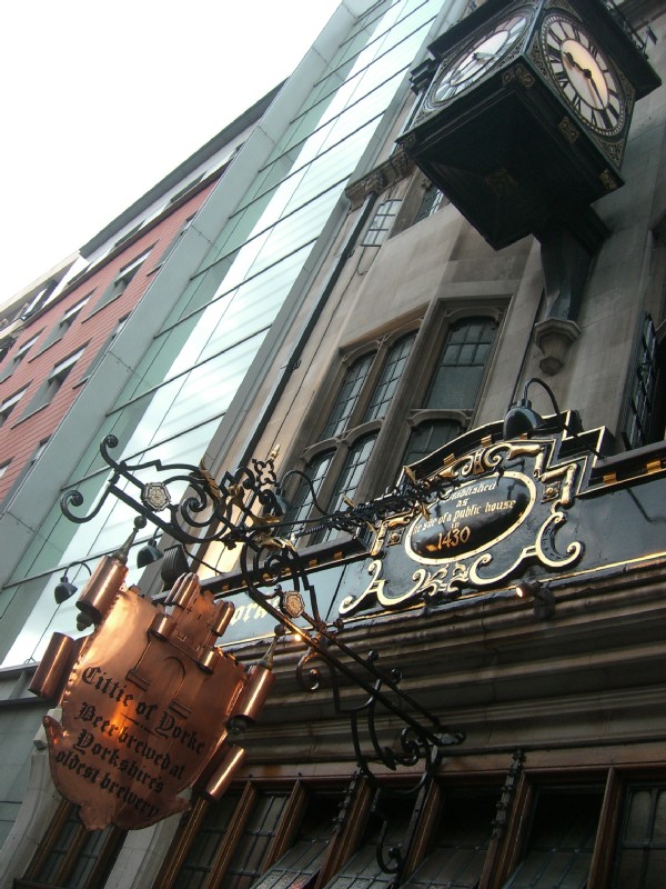 | 19:15:49 Nice picture of Chie and her Dad in the Lamb and Flag, a smashing little pub near Covent Garden. | 19:25:29 Outside the Lamb and Flag - I'm pulling a bit of a face. | 19:51:23 On the way in to the ever excellent Cittie of Yorke. |