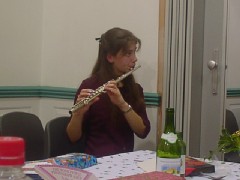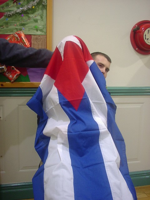 15:50:43 Chie standing on a ball. | 15:56:21 Bec playing the flute. | 15:58:24 Alex or Lucy presumably wrapped in this Cuban flag. | 16:00:16 Alex gives Bec a piggy back. |