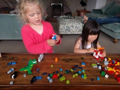 14:07:43 Chie had a lie down too. | 14:55:30 Lego dinosaur vs Lego robot. | 15:15:11 The girls playing with Lego. | 16:10:40 Chie, Erika and I went for a circular walk near the house later on in the afternoon, taking in this creek which probably looks a bit more picturesque when it isn't low tide. |