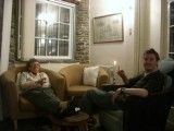 | 17:56:20 Chie peering into the kitchen window. | 20:32:32 Dad and Janie out on the terrace. | 21:28:54 A mild outbreak of hysterics as we tried to sort out how Vera was going to get back on Friday. |