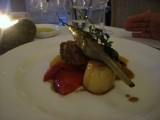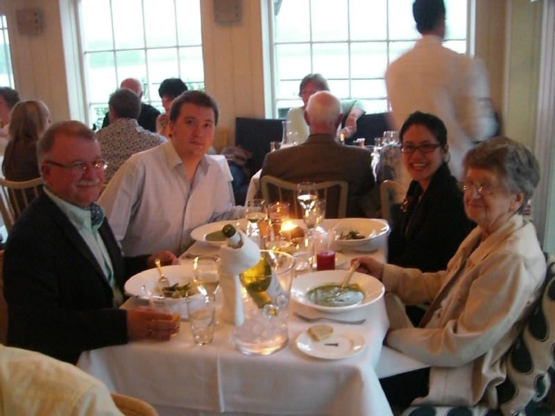 | 21:21:37 Later on that evening, a late dinner at the Hotel Tresanton in St. Mawes. This is Chie's starter - "monk cheeks" with broad beans. | 21:21:43 Me and Robin at dinner. | 21:22:36 A picture of the four of us taken by the waiter. |