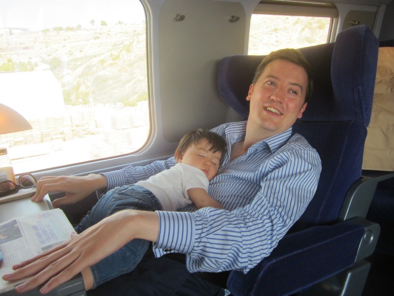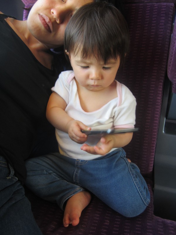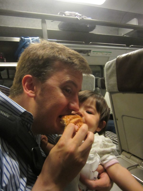 14:42:47 | 14:57:19 In the buffet car on the TGV. | 15:10:40 Erika enjoying the scenery. | 15:57:38 We didn't bring the buggy with us this time so were worried Erika wouldn't have anywhere to sleep on the train - this did not turn out to be a problem. |