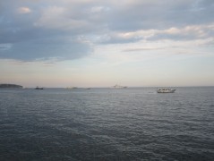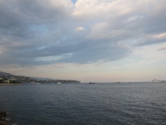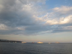 18:59:35 Views out to sea on our stroll from the hotel to the restaurant. | 18:59:44 Lots of yachts in the bay. | 18:59:51 | 19:06:49 Me and Erika on the seafront. |