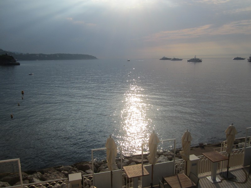07:49:34 In the lift heading down to breakfast. | 07:54:10 The restaurant where breakfast is served - not a bad spot. | 07:57:24 Rather lovely views out over the terrace to sea, and the ubiquitous yachts. | 07:57:34 ...and still a touch of pink in the sky. |