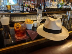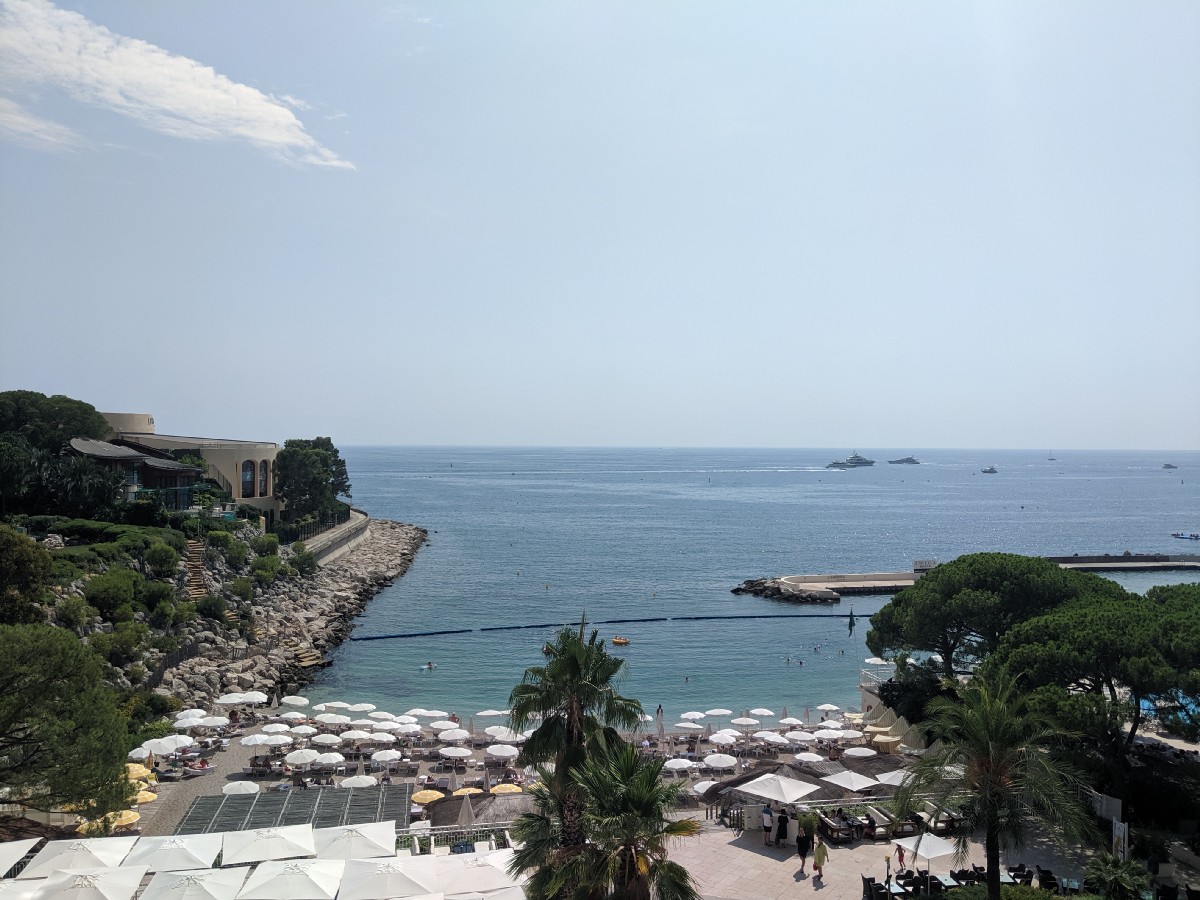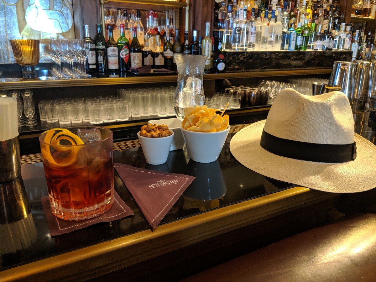 11:43:19 A coffee at Rene Socca before heading to get a taxi to Monaco. | 13:18:24 On arrival at our hotel in Monaco - fortunately we were able to check in early, here's the view from our room. | 15:53:51 After a bit of a swim I left the girls to spend more time lounging at the beach / pool so I could go for a bit of a wander around Monaco. I decided to have a cocktail at the Bar Americain in the Hotel de Paris. | 15:55:50 My hat seemed to fit in here. The snacks were good too - those things which looked like crisps were actually socca chips. |