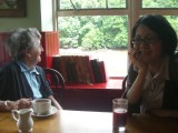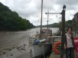 | 11:12:25 This boat moored outside our flat was a source of intrigue for a couple of days, as you can see here it appears to be listing, although this may have just been because it was low tide. | 12:04:49 The Maltsters Arms. I'd been here once before, in 2002, with Dad and Chie, at the end of a day trip to Dartmouth. Since then it had stuck in my memory and I'd been keen to go back. | 12:18:28 Vera and Chie in the Maltsters, enjoying our little nook in the corner. |