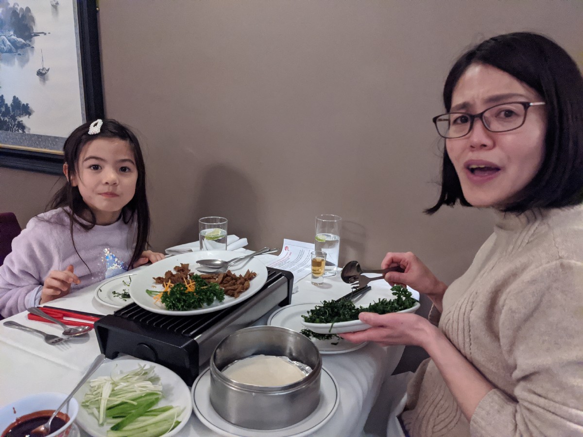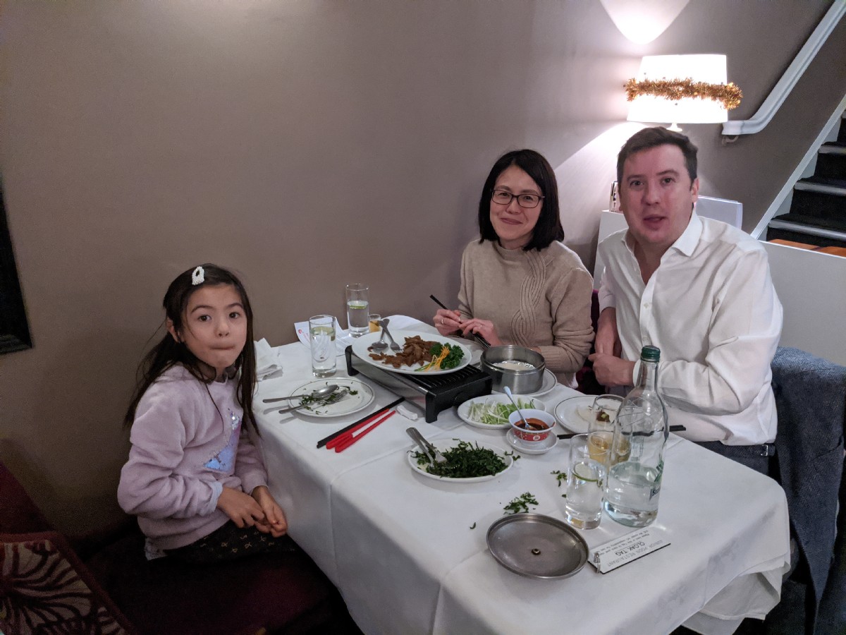 17:41:29 Clevedon pier seen again from the Moon and Sixpence pub, where we went while waiting for the restaurant we'd chosen for dinner to open. | 18:41:05 At dinner in the Junior Poon in Clevedon - somehow Chinese food felt appropriate. | 18:41:20 They had a decent vegetarian selection on the menu including mock duck pancakes. | 18:42:16 The three of us taken by the waitress. The pictures in here all came out a bit grainy - it seemed everywhere in Clevedon could do with brighter lighting! |