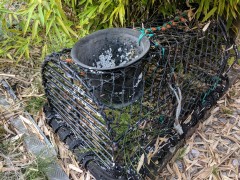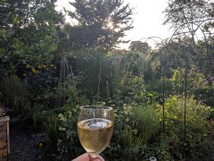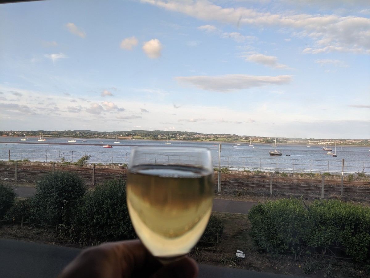 19:36:28 Enjoying a glass of Dad's cider with the view from the lounge. | 19:38:00 ...and now cider in the garden. | 19:38:59 A lobster pot. | 19:44:37 Erika having soup as a starter for dinner. |