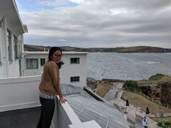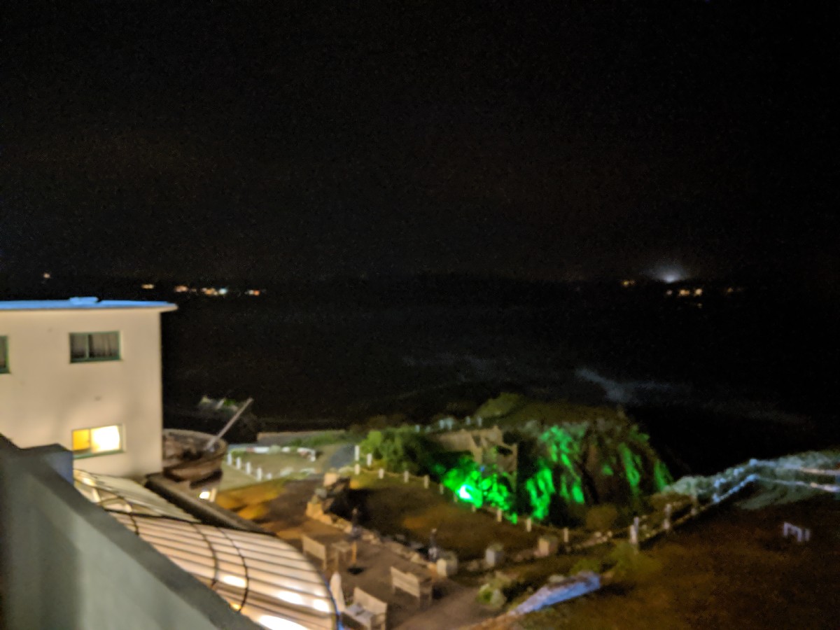 19:50:51 Erika showing off the gap where her tooth was, and looking appropriately piratey given the nautical setting. | 19:54:30 Picture of our table taken by the waiter. | 19:54:32 | 20:30:52 I went out on the balcony of the restaurant for some sea air. |