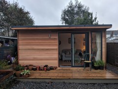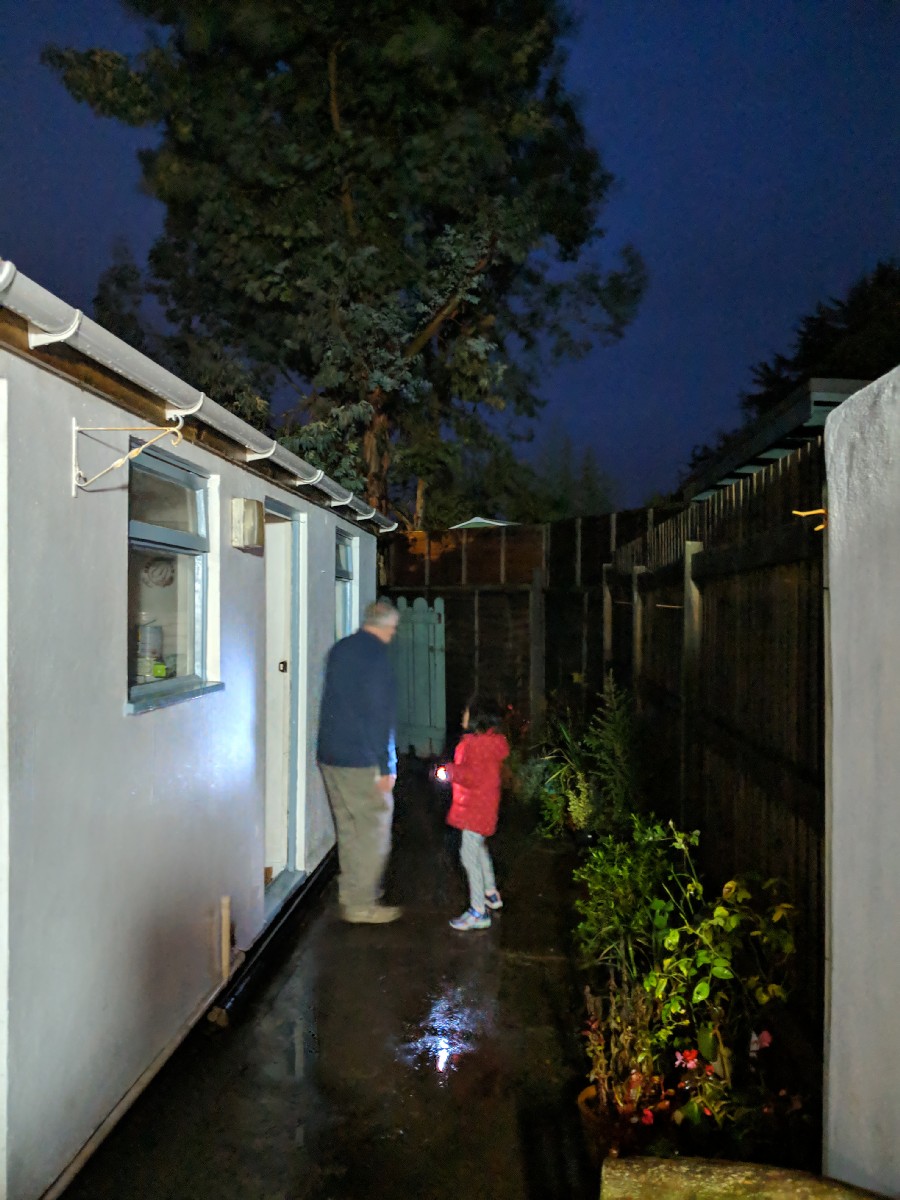 13:17:33 In the lounge of Dad's new house. | 15:27:02 Erika taking Jess the dog out for a walk. | 15:53:29 The newly built garden room. | 17:02:56 Dad and Erika outside. |
