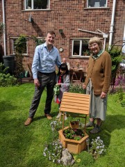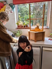 14:03:27 Mum and Erika having dessert outside in the garden. | 14:08:32 ...and fairy cakes! | 14:13:19 | 15:16:46 Erika with Mum's sock machine. |