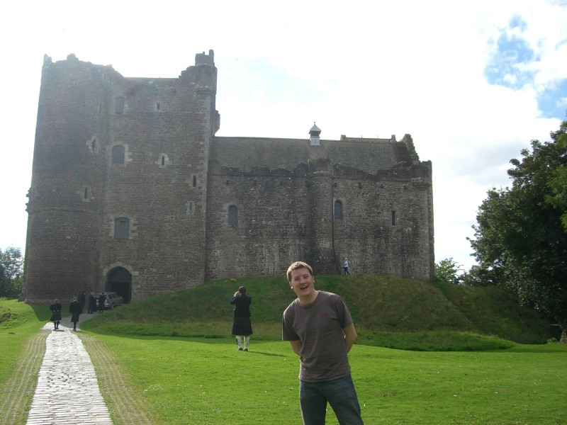 | 12:28:07 Lancelot charged through here, randomly killing people. | 12:29:17 Me standing where John Cleese and Michael Palin once stood. In the film this courtyard is made to look like it is indoors if I recall correctly. | 12:30:16 A bit of a tribute to the film in the exhibition room here. |