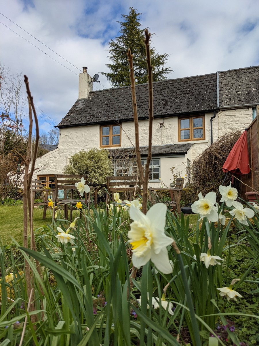 15:55:06 Our home for the next four nights - this cottage in Clearwell in the Forest of Dean. | 15:58:11 The cottage as seen from the garden. | 16:03:37 Erika and I exploring the cottage. | 16:03:46 The main bedroom. |
