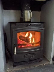 18:22:54 Chie and Erika having dinner in the cottage. | 19:30:58 Got the wood burner going after dinner. | 20:01:21 Toasting the sunset with a glass of perry from Severn Cider. | 20:01:27 The view of the sunset from here is a bit obscured but still a nice glimpse of orangey pink sky. |