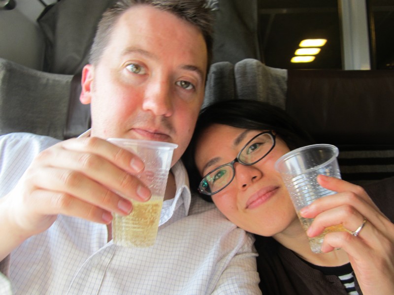 13:20:10 Outside the boulangerie we went to after lunch, called "Du Pain et Des Idees". | 14:22:16 Gare du Nord. | 15:24:20 Aboard the Eurostar. To round off the trip, a half bottle of Laurent Perrier, and some of the bread we bought earlier. | 15:24:29 Cheers! |