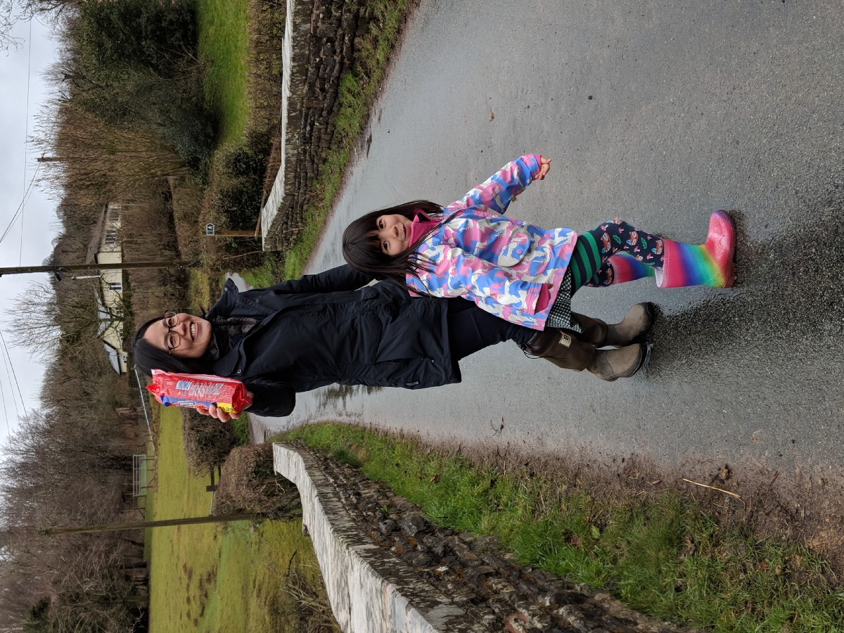 10:35:19 Erika doing an impromptu karaoke performance in the castle grounds. | 10:51:56 Back at the cottage. | 10:52:04 Chie and Erika on the bridge over the Monnow by the cottage. | 10:55:09 Chie and Erika inspecting the river. |