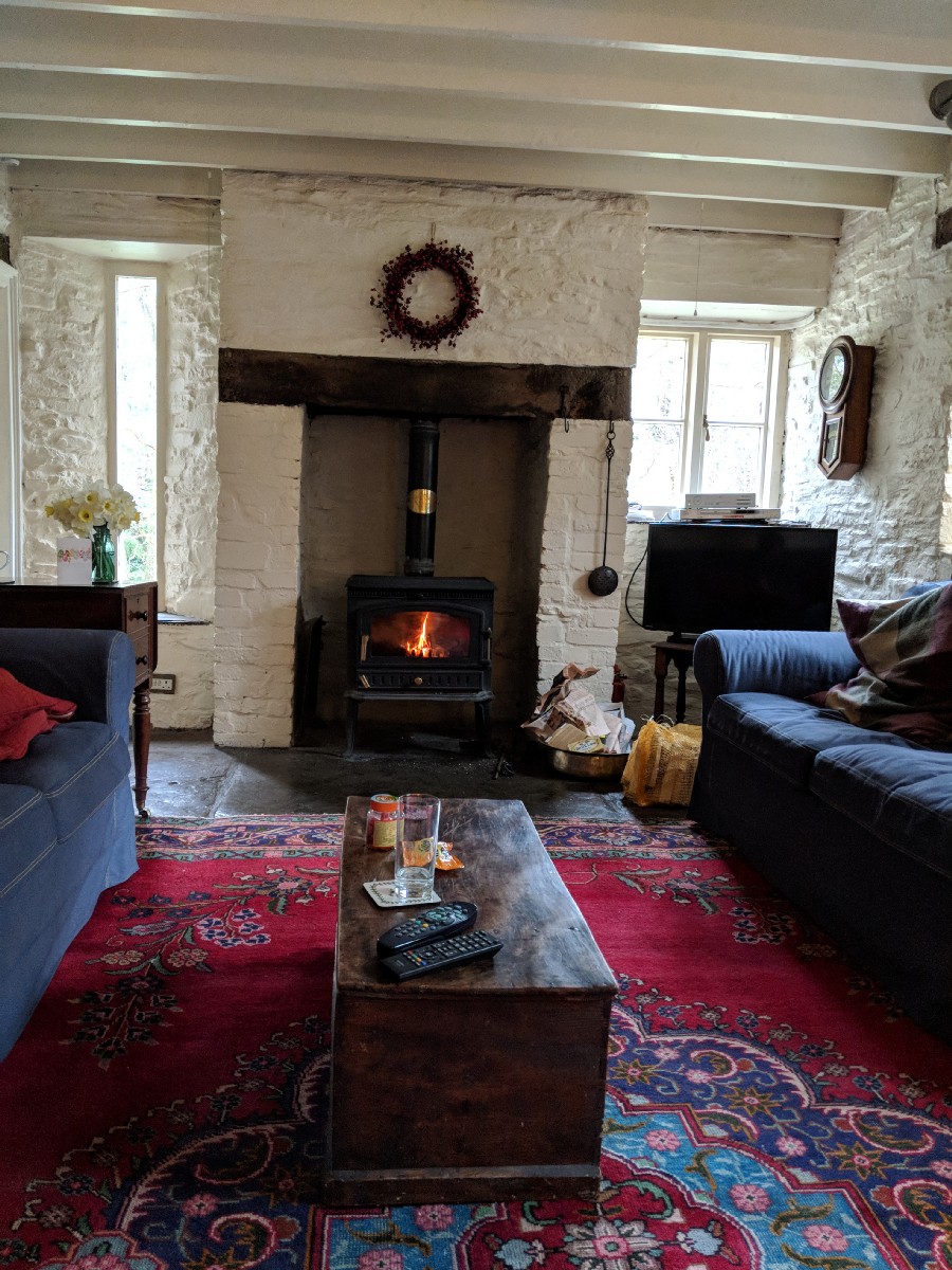 17:39:40 | 17:40:37 Nice door beside the pub car park. | 18:01:15 Back in the cottage, first order of business was to get the fire going. | 18:47:15 Jacket potatoes for dinner, another lovely meal beside the river. |