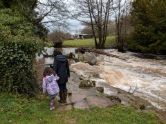 07:16:52 The river had risen overnight with all the rain and slightly worryingly was starting to come up over the bank a bit! | 07:34:40 The river as seen from the kitchen door to illustrate how it was slightly unnerving. | 07:36:03 ...and the river seen through the kitchen window. | 08:06:28 Chie and Erika having pain au chocolat for breakfast. |