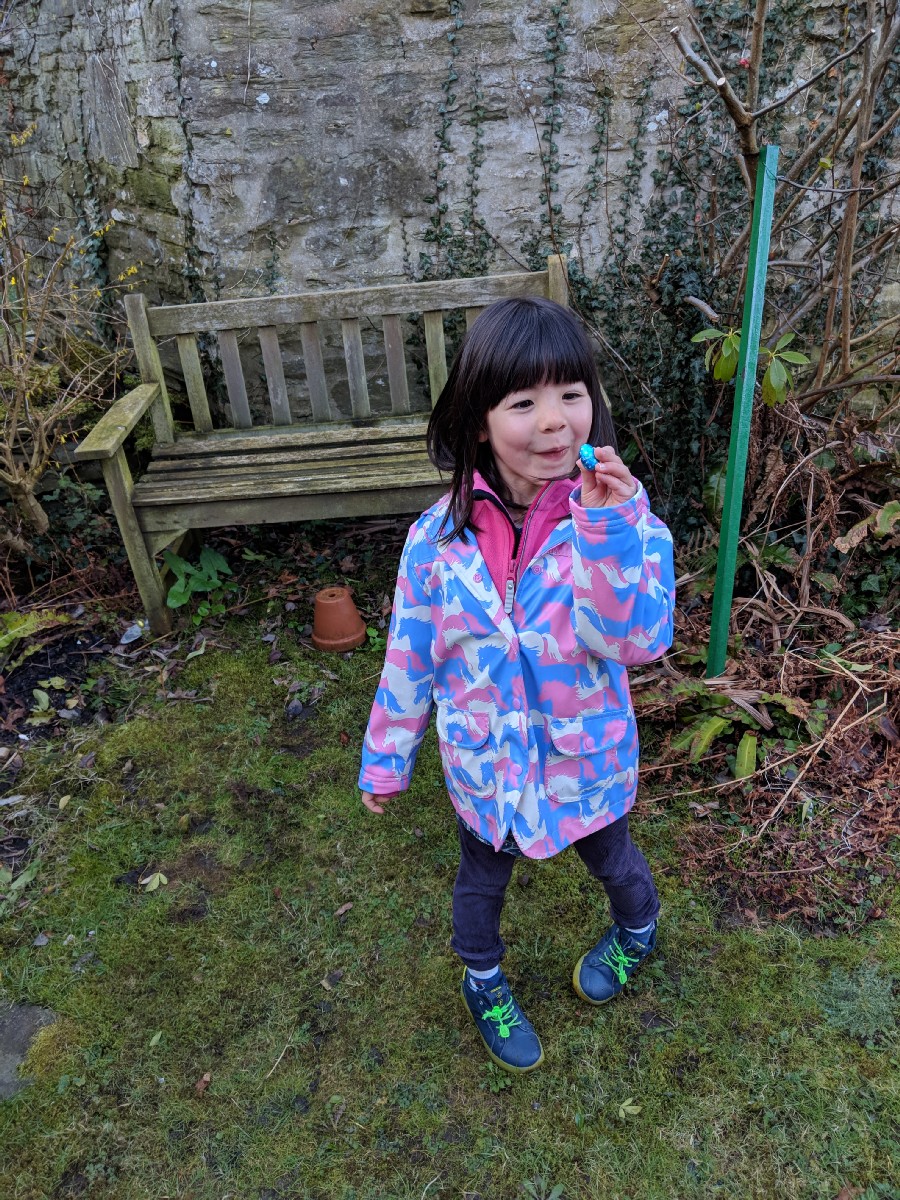 08:50:49 | 08:53:28 I think she's almost found them all now. | 08:54:15 Looking over the wall into the pub garden, and then on to the ridge beyond. | 09:16:38 Erika with the fruits of her morning's Easter egg hunting. |