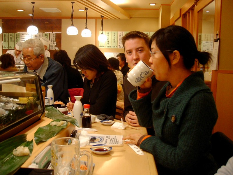 Monday 12:50 It seemed difficult to have a meal at Chie's parents house without being given a beer to go with it! Plus also note the rather nice coasters - made from old whisky barrels. |