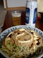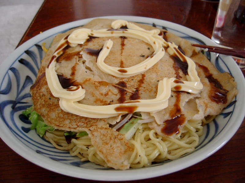 Sunday 13:47 Connoiseurs will of course note this is the Hiroshima style of okonomiyaki rather than the Osaka style - a heaver emphasis on noodles denotes the Hiroshima version. Oh, and it is of course served with beer. |