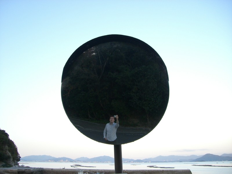 A self portrait in one of those roadside mirrors that let people in cars see round the corner.