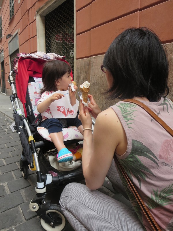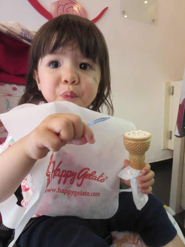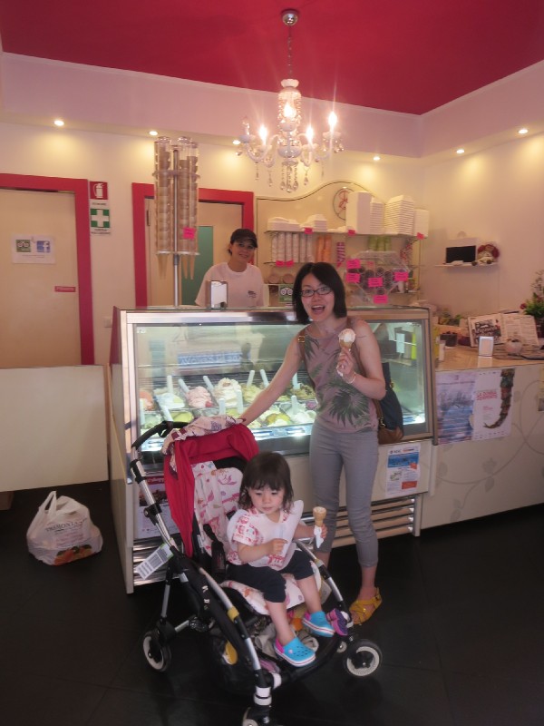 15:24:29 Happy Gelato - Erika was given a bib and a little bambino sized ice cream at Profumo di Rosa. | 15:27:17 Inside Profumo di Rosa, with the very nice lady who runs it. | 15:31:34 More ice cream fun. | 15:32:21 Outside of Profumo di Rosa. For me this was the best gelato of the trip. |