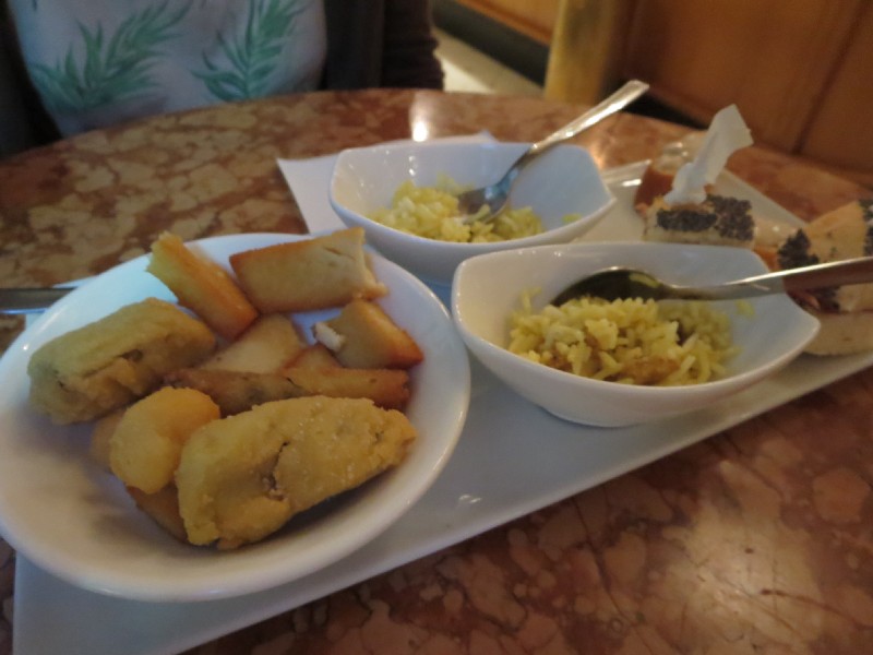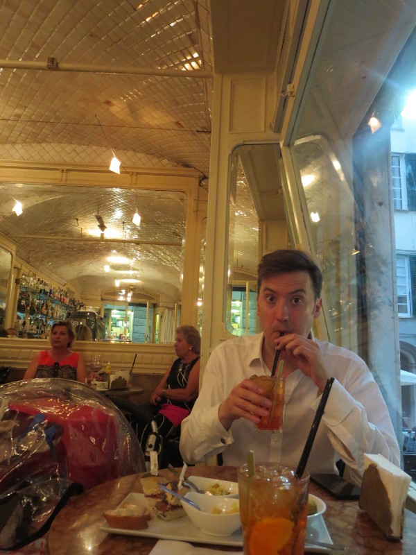 18:51:07 Caffe degli Specchi - the cafe of mirrors. One of Genoa's oldest cafes. | 18:53:57 We just ordered a couple of pre-dinner drinks whilst Erika was having an early evening nap, and a rather impressive array of snacks appeared - our first time to experience the recent aperitivo trend in Italy. | 18:54:55 Our drinks and snacks. | 18:55:02 Me with a silly facial expression. |