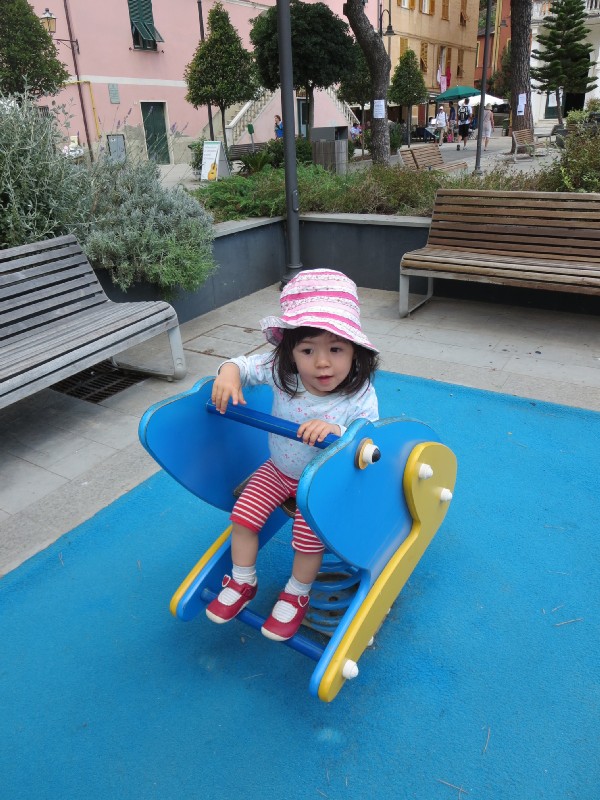 14:11:54 My deep fried pizza. Actually quite good. | 14:13:33 Eating our lunch on a bench in the town square. | 14:37:30 Erika had a play on the swings in the little park in the town. | 14:38:28 |
