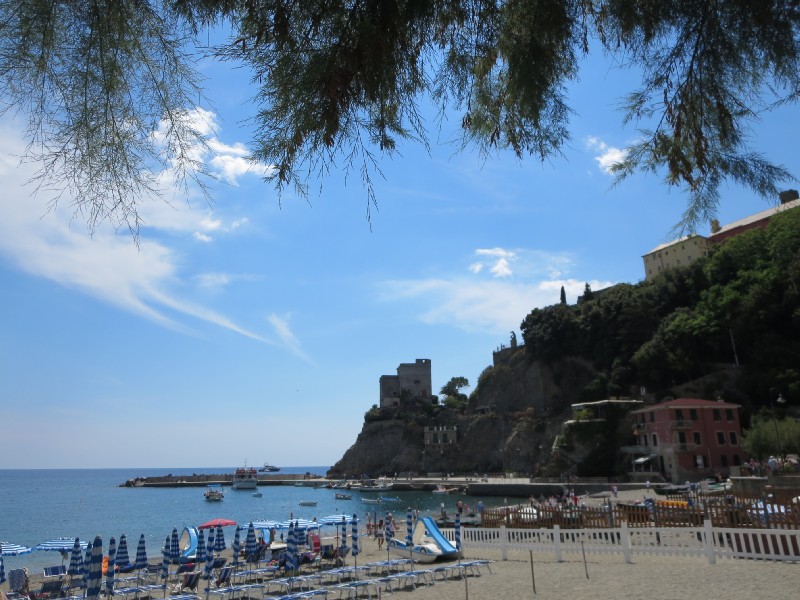12:07:12 Erika eating her pasta back on the boat. | 12:33:17 Now at Monterosso al Mare. | 12:43:13 Waving the boat off. | 13:07:56 Our hotel room in Monterosso. Pleasing light and modern after the rather disappointing room in Sestri Levante. |