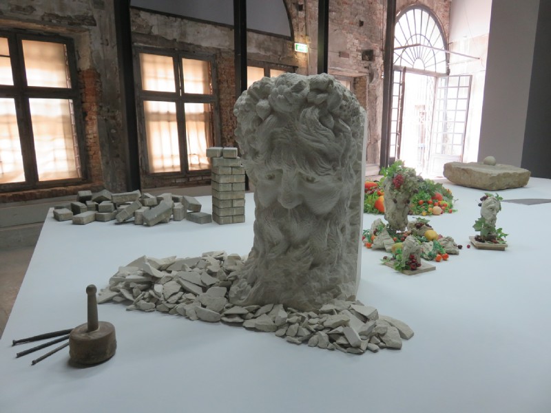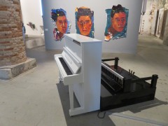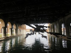 10:34:07 This installation made use of the impressive columns of the Arsenale. | 10:40:13 A broken plate and a side board. | 10:41:21 Two pianos, one vertical, one horizontal. The vertical one was playing music by itself. | 10:42:04 Maritime. |