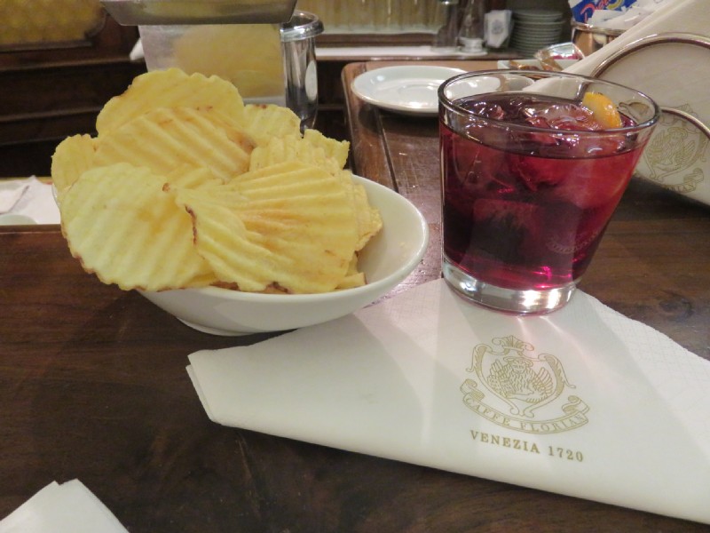 17:41:33 Outside Harry's Bar. Very subtle signage. | 17:51:23 Next, I decided to go back to the bar at Caffe Florian (I'd been for coffee in the morning) and try a couple of their cocktails. First, a Negroni made with the new Martini Riserva, which I'd been chatting to the barman about in the morning. | 18:14:48 Then the Florian cocktail - perhaps a cousin of the Negroni, featuring a liqueur I hadn't seen before called Aurum. | 18:55:54 Outside Caffe Florian. |