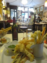 11:49:26 | 13:18:47 At Mario alla Fava where I went for lunch. A business card from Cyril Golding, a member of the Magic Circle. | 13:33:20 Really liked this old photo. | 13:37:34 My first course (they impressively had a vegan menu here) was I suppose a sort of vegan version of the popular Venetian dish fritto misto. Really enjoyed this. |