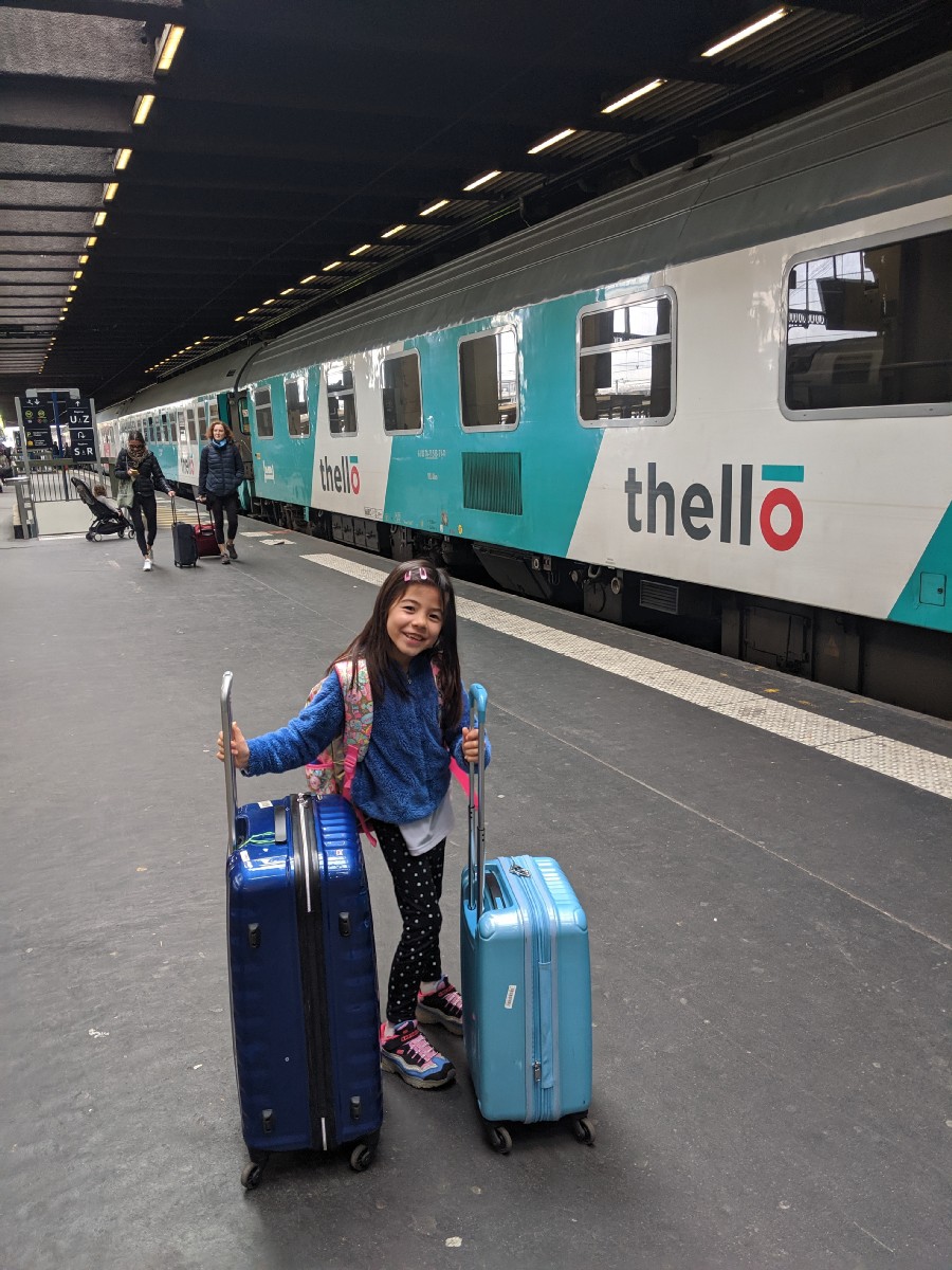 13:57:48 Erika on the bridge over the river Seine, at the point at which we'd decided to just give up, get an Uber to Gare du Nord, and see if we could get an earlier Eurostar back to London. | 16:21:29 Erika on the Eurostar, on which we ate pretzels. |
