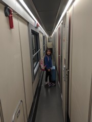 08:40:45 Erika and I in the sleeper train in the morning. I look a little grizzly here - I think I only managed 3 or 4 hours sleep. | 09:31:11 Erika in the buffet car getting breakfast. | 09:38:11 Erika wanted to have breakfast in bed so we weny back to our cabin for it. | 10:06:07 Erika brushing her teeth. |