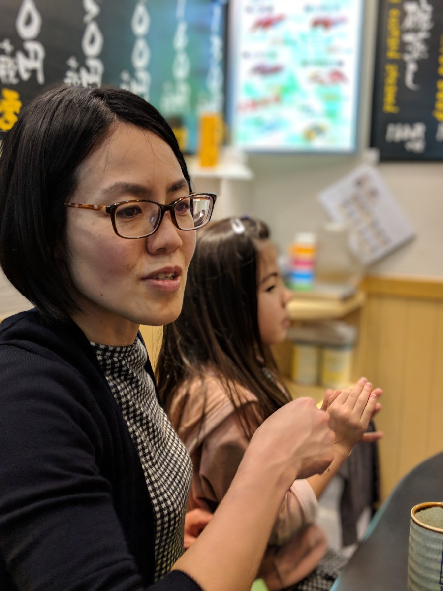 11:46:37 Erika in the kaiten sushi place in Narita airport. | 11:46:43 Chie in the sushi place. | 11:47:58 Whilst it may appear in local time the sun had not yet gone over the yard time, I was still very much on UK time where it was just before 2am. | 11:50:34 Chie and Erika having some sushi. |
