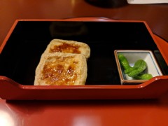 19:35:19 Sake barrel inside the restaurant. | 20:08:55 First course of dinner, involving peanut tofu and lily bulb tempura. | 20:18:56 Erika tucking into her dinner. | 20:24:43 Second course: deep fried tofu with miso. |