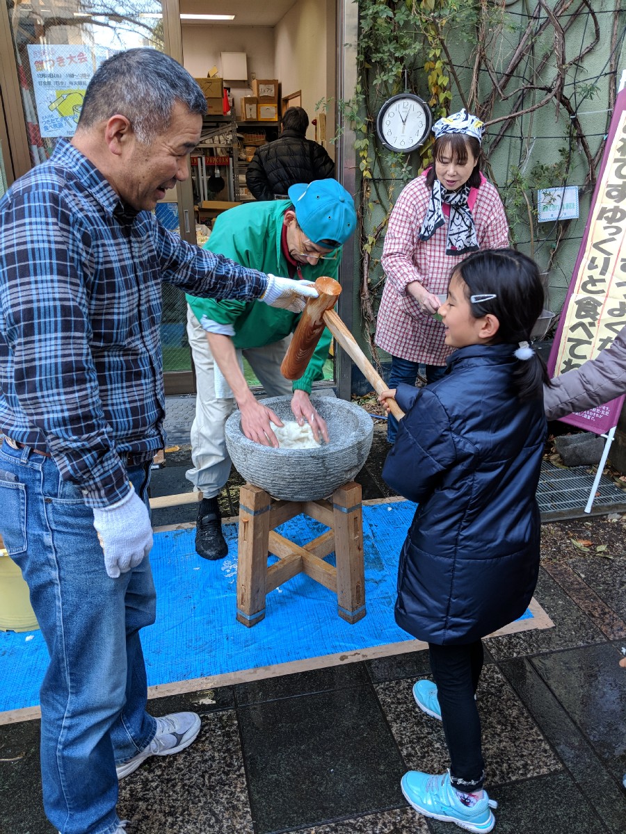 10:45:41 | 11:01:49 Near our hotel there was some kind of local community event where they were making mochi. | 11:02:43 Erika trying some of the freshly made mochi. | 11:04:44 Chie looking incredibly happy for having some baked sweet potatoes. |